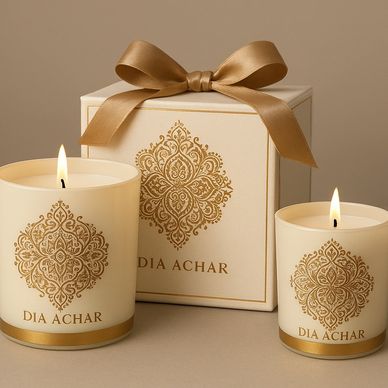 Two elegant off-white Dia Achar scented candles, one large and one small, feature intricate golden bronze designs with metallic accents, paired with a luxurious cream box tied with a satin ribbon.