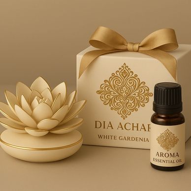 A decorative tabletop lotus-shaped aroma diffuser with golden accents, paired with a white gardenia aroma essential oil, perfect for creating a relaxing ambiance.